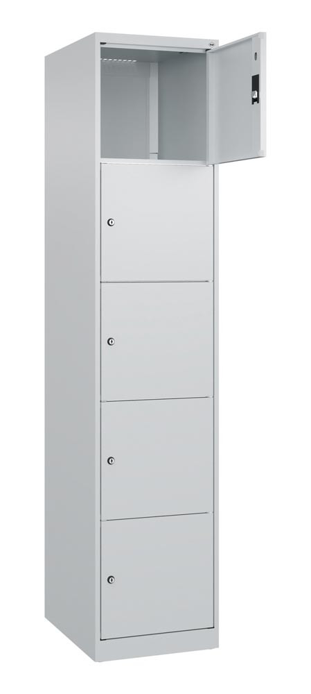 Fächerschrank, BxTxH 300x500x1850 mm, 1x5 Fächer, Abt.B 300 mm, bodenstehend, Schloss, glatte Türen, RAL 7035 E6479329