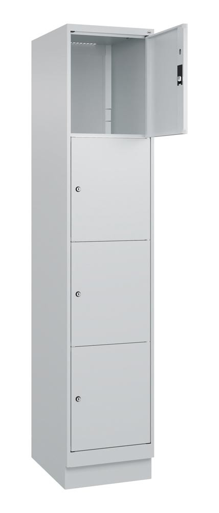 Fächerschrank, BxTxH 400x500x1950 mm, 1x4 Fächer, Abt.B 400 mm, Sockel, Schloss, glatte Türen, RAL 7035 E6479311