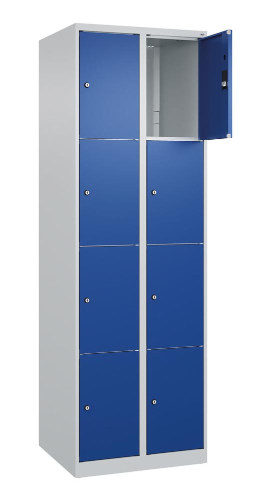 Fächerschrank, BxTxH 600x500x1850 mm, 2x4 Fächer, Abt.B 300 mm, bodenstehend, Schloss, glatte Türen, RAL 7035/5010