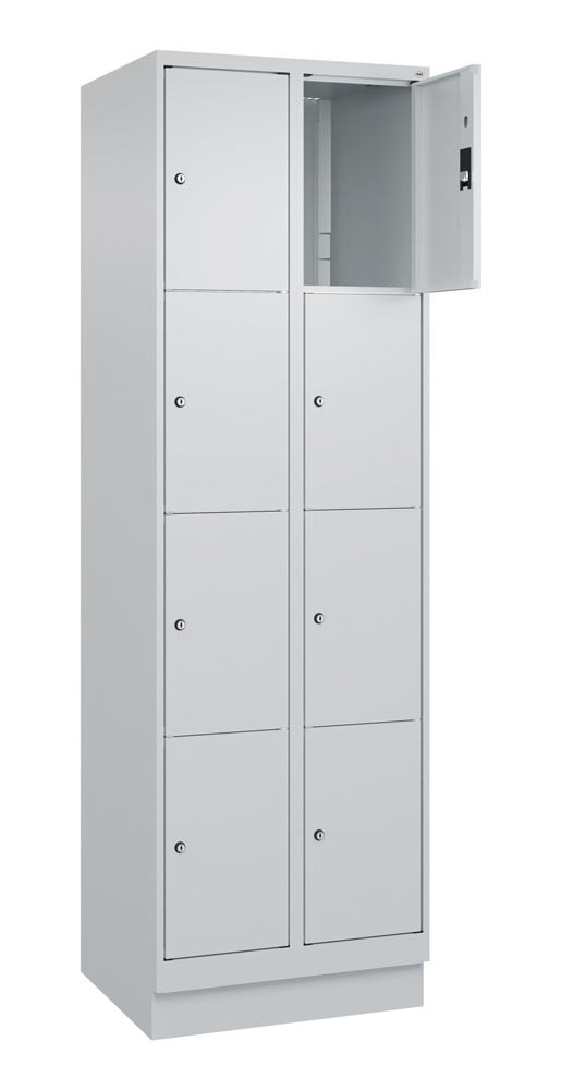 Fächerschrank, BxTxH 600x500x1950 mm, 2x4 Fächer, Abt.B 300 mm, Sockel, Schloss, glatte Türen, RAL 7035
