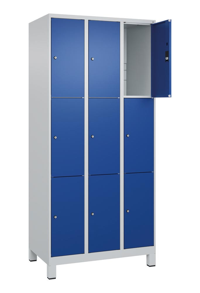 Fächerschrank, BxTxH 900x500x1950 mm, 3x3 Fächer, Abt.B 300 mm, Füße, Schloss, glatte Türen, RAL 7035/5010