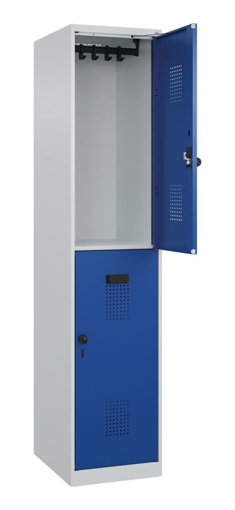Fächerschrank, Stahl, doppelstöckig, 1x2 Fächer, Abt.B 300 mm, bodenstehend, Drehriegel, BxTxH 300x500x1850 mm, RAL 7035/5010 E6479393