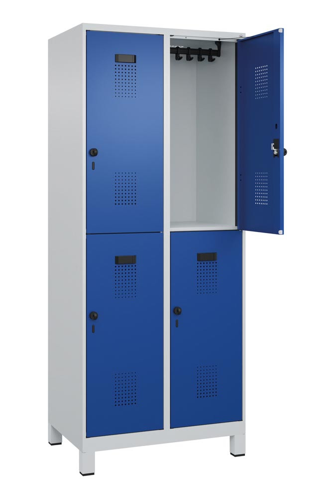 Fächerschrank, Stahl, doppelstöckig, 2x2 Fächer, Abt.B 400 mm, Füße, Drehriegel, BxTxH 800x500x1950 mm, RAL 7035/5010