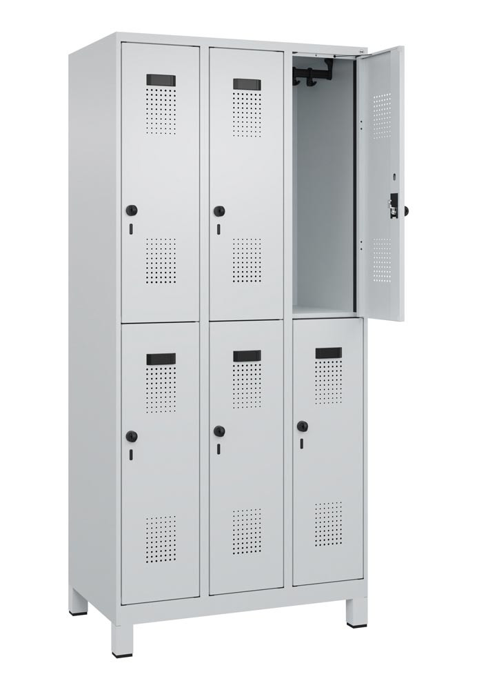 Fächerschrank, Stahl, doppelstöckig, 3x2 Fächer, Abt.B 300 mm, Füße, Drehriegel, BxTxH 900x500x1950 mm, RAL 7035