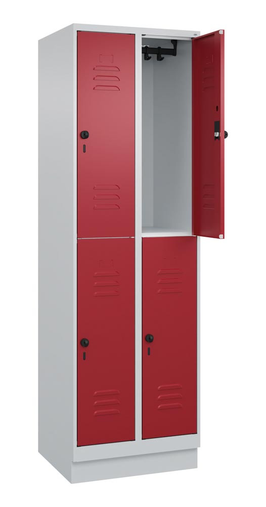 Fächerschrank, doppelstöckig, BxTxH 600x500x1950 mm, 2x2 Fächer, Abt.B 300 mm, Drehriegel, Sockel, Farbwahl