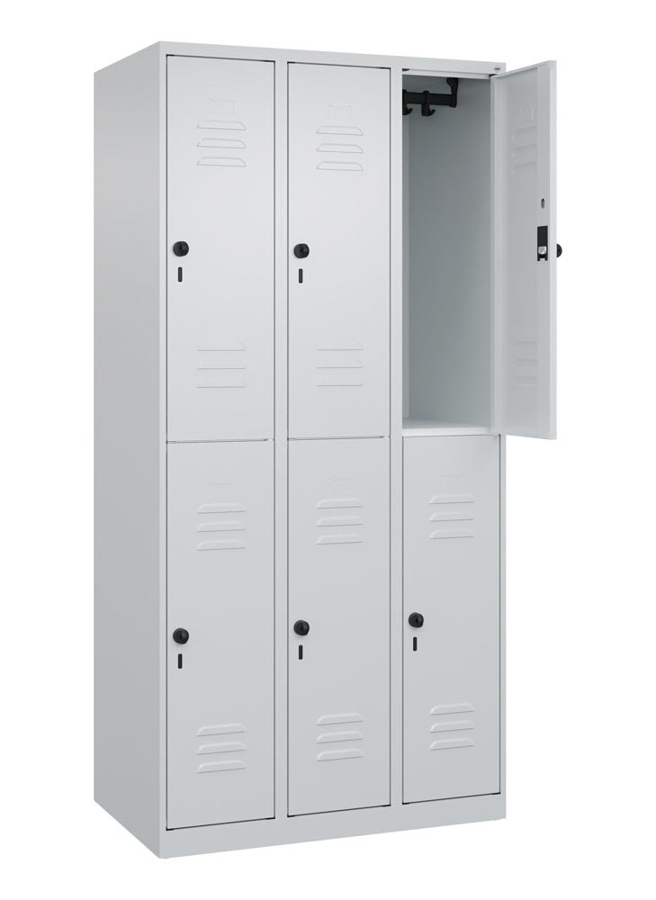 Fächerschrank, doppelstöckig, BxTxH 900x500x1850 mm, 3x2 Fächer, Abt.B 300 mm, Drehriegel, bodenstehend, RAL 7035