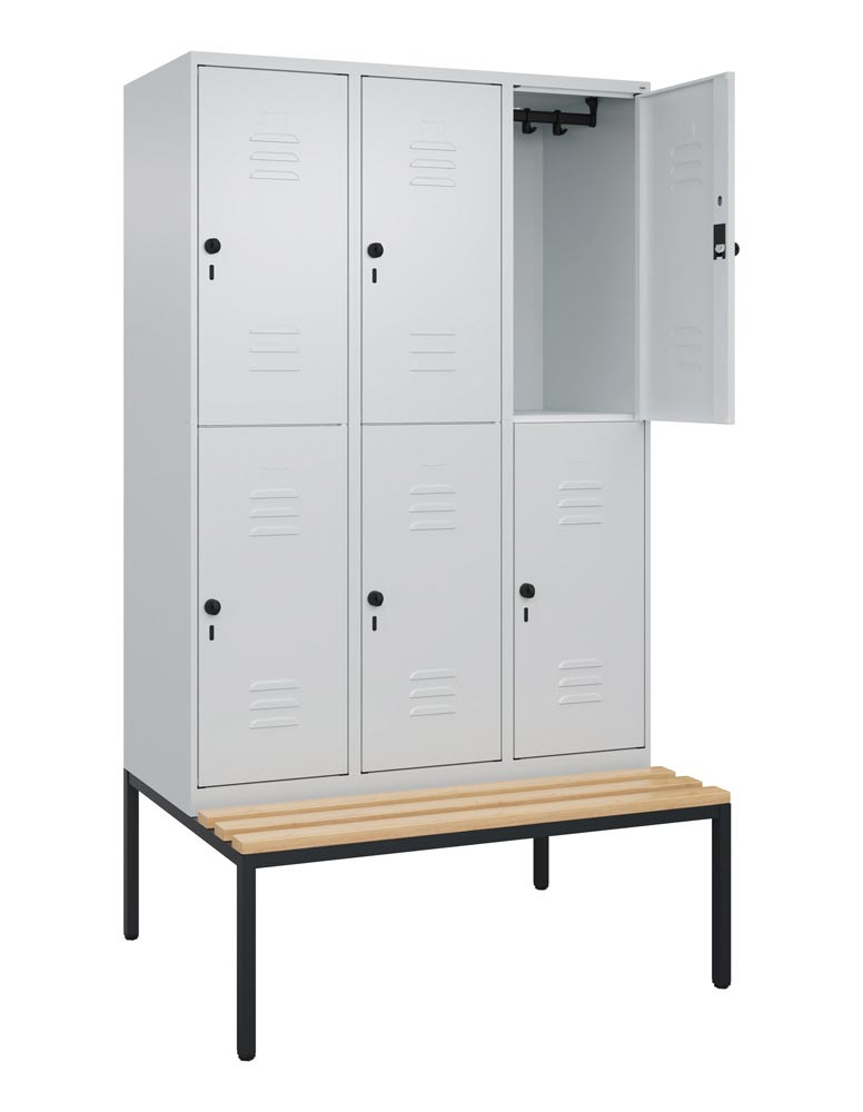 Fächerschrank, untergeb. Sitzbank, BxTxH 1200x500x2120 mm, 3x2 Fächer, Abt.B 400 mm, doppelstöckig, Bucheleisten, Drehriegel, RAL 7035