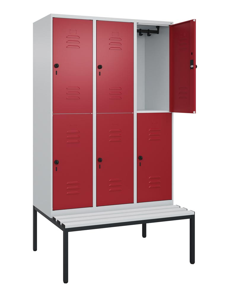 Fächerschrank, untergeb. Sitzbank, BxTxH 1200x500x2120 mm, 3x2 Fächer, Abt.B 400 mm, doppelstöckig, Kunststoffleisten, Drehriegel, Farbwahl