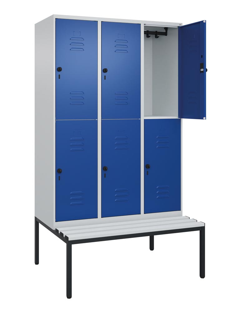 Fächerschrank, untergeb. Sitzbank, BxTxH 300x500x2120 mm, 1x2 Fächer, Abt.B 300 mm, doppelstöckig, Kunststoffleisten, Drehriegel, Farbwahl E6479184