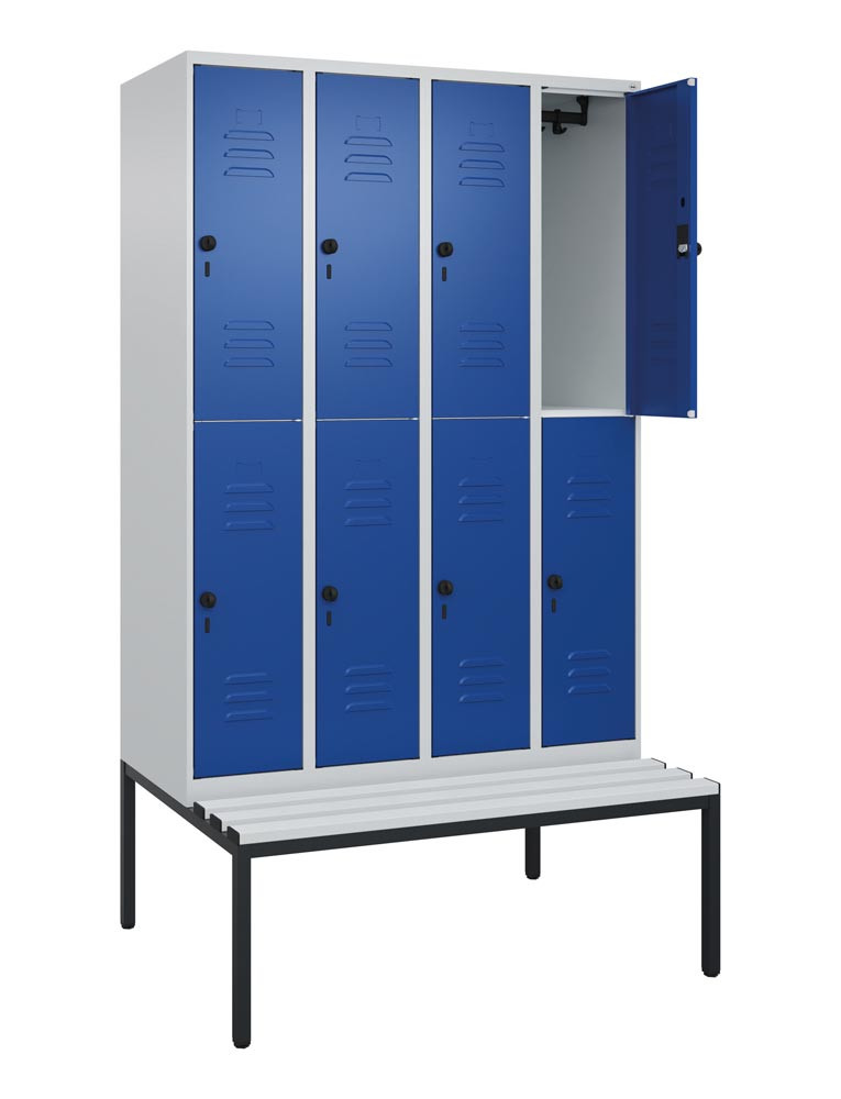Fächerschrank, untergeb. Sitzbank, BxTxH 1200x500x2120 mm, 4x2 Fächer, Abt.B 300 mm, doppelstöckig, Kunststoffleisten, Drehriegel, RAL 7035/5010