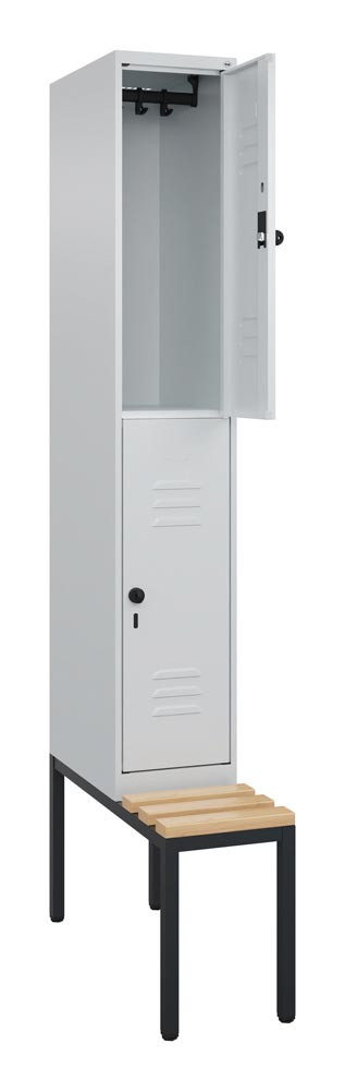Fächerschrank, untergeb. Sitzbank, BxTxH 300x500x2120 mm, 1x2 Fächer, Abt.B 300 mm, doppelstöckig, Bucheleisten, Drehriegel, RAL 7035 E6479161