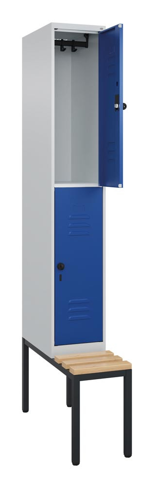 Fächerschrank, untergeb. Sitzbank, BxTxH 300x500x2120 mm, 1x2 Fächer, Abt.B 300 mm, doppelstöckig, Bucheleisten, Drehriegel, RAL 7035/5010 E6479162