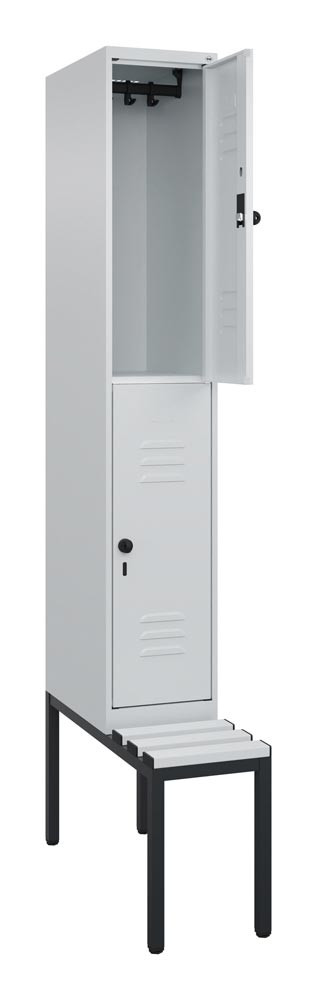 Fächerschrank, untergeb. Sitzbank, BxTxH 400x500x2120 mm, 1x2 Fächer, Abt.B 400 mm, doppelstöckig, Kunststoffleisten, Drehriegel, RAL 7035 E6479185