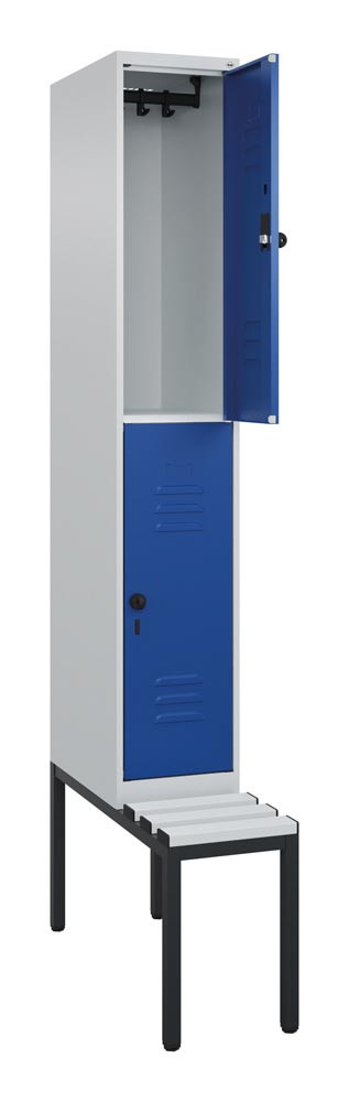 Fächerschrank, untergeb. Sitzbank, BxTxH 300x500x2120 mm, 1x2 Fächer, Abt.B 300 mm, doppelstöckig, Kunststoffleisten, Drehriegel, Farbwahl E6479184