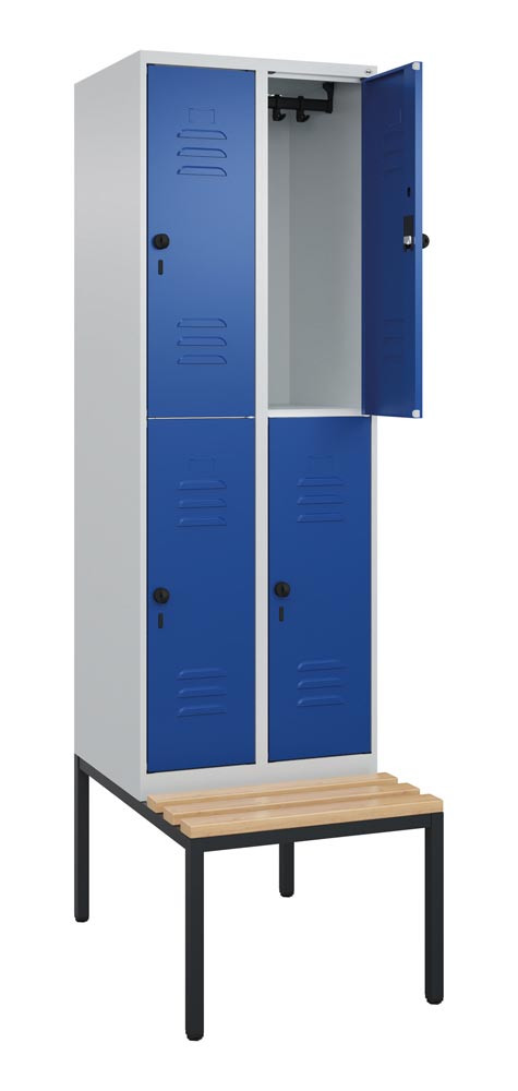Fächerschrank, untergeb. Sitzbank, BxTxH 600x500x2120 mm, 2x2 Fächer, Abt.B 300 mm, doppelstöckig, Bucheleisten, Drehriegel, RAL 7035/5010