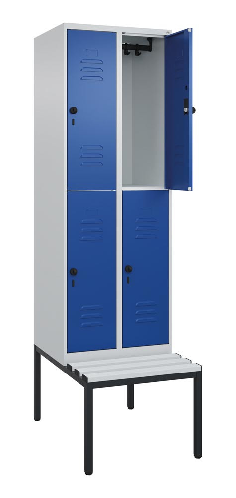 Fächerschrank, untergeb. Sitzbank, BxTxH 600x500x2120 mm, 2x2 Fächer, Abt.B 300 mm, doppelstöckig, Kunststoffleisten, Drehriegel, RAL 7035/5010