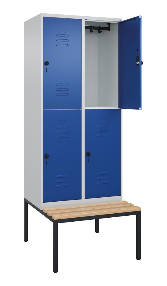 Fächerschrank, untergeb. Sitzbank, BxTxH 800x500x2120 mm, 2x2 Fächer, Abt.B 400 mm, doppelstöckig, Bucheleisten, Drehriegel, RAL 7035/5010
