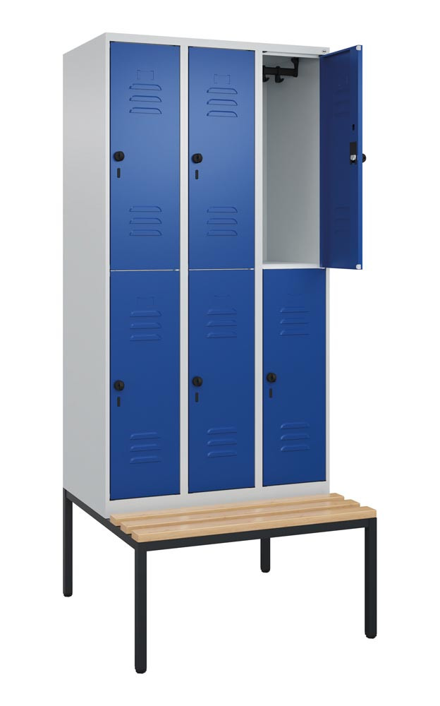 Fächerschrank, untergeb. Sitzbank, BxTxH 900x500x2120 mm, 3x2 Fächer, Abt.B 300 mm, doppelstöckig, Bucheleisten, Drehriegel, RAL 7035/5010