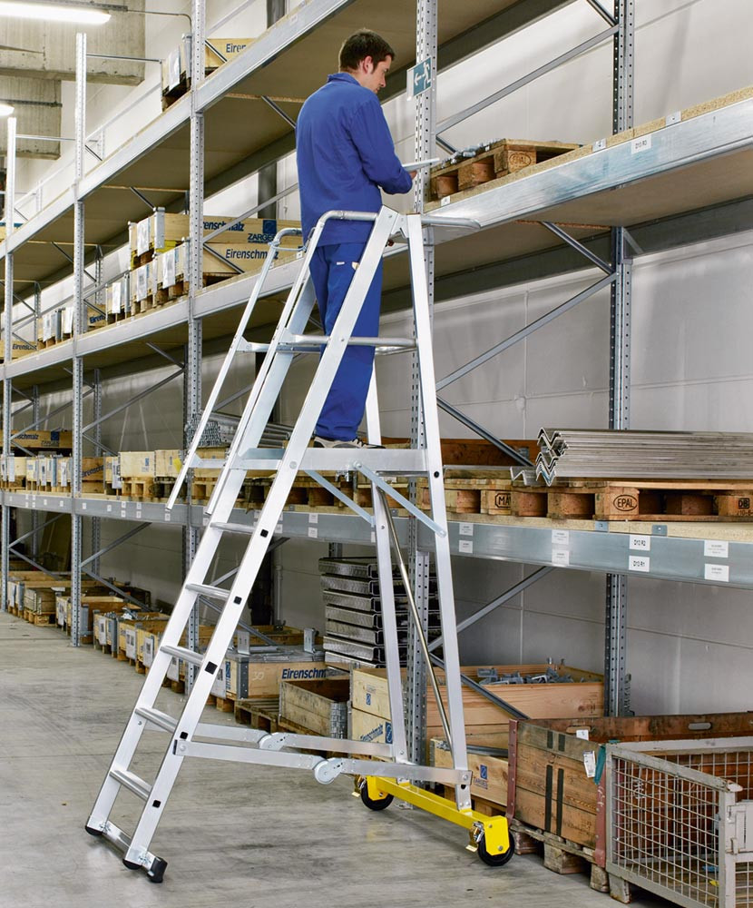 ∙ Hergestellt aus korrosionsfreiem Aluminium ∙ 80 mm tiefe Stufen mit Kunststoffeinsätzen zur Rutschsicherung ∙ Rutschfeste Aluminium-Arbeitsplattform 600 x 630 mm mit dreiseitigem Sicherheitsgeländer ∙ Steigteil mit Quertraverse ab 6 Stufen ∙ Stützteil mit Quertraverse und Laufrollen Ø 160 mm mit Feststellvorrichtung ∙ Große Kommissionierablage ∙ Durch Scharniere in beiden Diagonalstreben platzsparend zusammenklappbar ∙ Handläufe legen sich beim Zusammenklappen automatisch an ∙ Auswechselbare Schuhe aus Kunststoff an den Leiterfüßen ∙ Entspricht EN 131-7