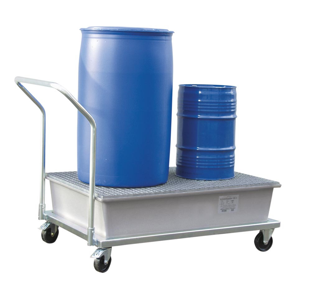 Fahrbare Auffangwanne aus GFK, Verz. Gitterrost, Fahrgestell mit Rammschutz, 2 Lenk- und 2 Bockrollen, Auffangvolumen 210 l, BxTxH 860x1090x1080 mm