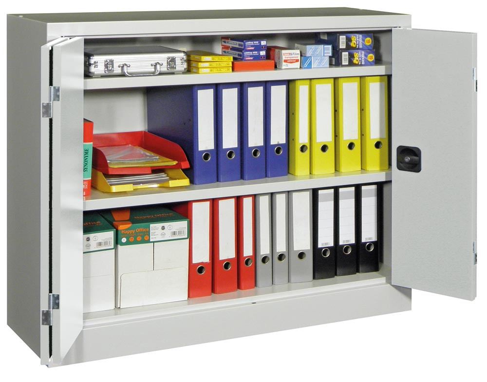 ∙ Stabile Stahlblechkonstruktion ∙ Oberfläche pulverbeschichtet ∙ Schränke mit gemeinsam verschließbaren Vollblech-Falttüren und Verstärkungstaschen ∙ Die Türen sind über einen dreiriegeligen Drehgriff mit integriertem Zylinderschloss inkl. 2 Schlüsseln verschließbar ∙ Böden im Raster von 17 mm höhenverstellbar, Belastbarkeit je Boden 80 kg bei gleichmäßig verteilter Last ∙ Max. Gehäusebelastbarkeit 600 kg
