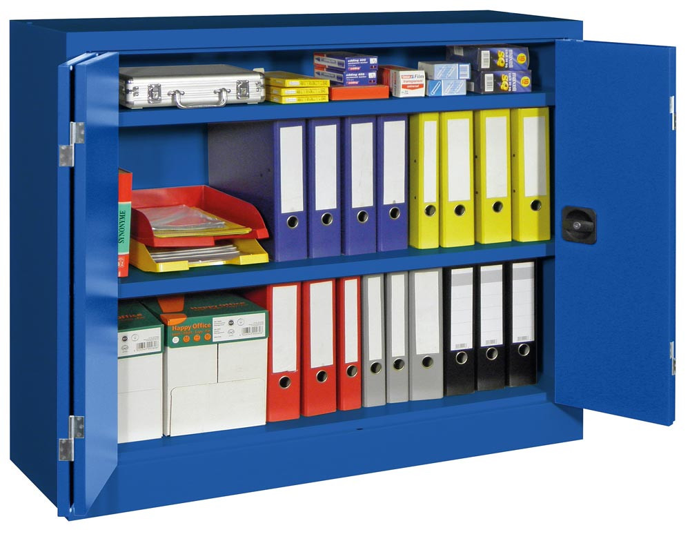 ∙ Stabile Stahlblechkonstruktion ∙ Oberfläche pulverbeschichtet ∙ Schränke mit gemeinsam verschließbaren Vollblech-Falttüren und Verstärkungstaschen ∙ Die Türen sind über einen dreiriegeligen Drehgriff mit integriertem Zylinderschloss inkl. 2 Schlüsseln verschließbar ∙ Böden im Raster von 17 mm höhenverstellbar, Belastbarkeit je Boden 80 kg bei gleichmäßig verteilter Last ∙ Max. Gehäusebelastbarkeit 600 kg