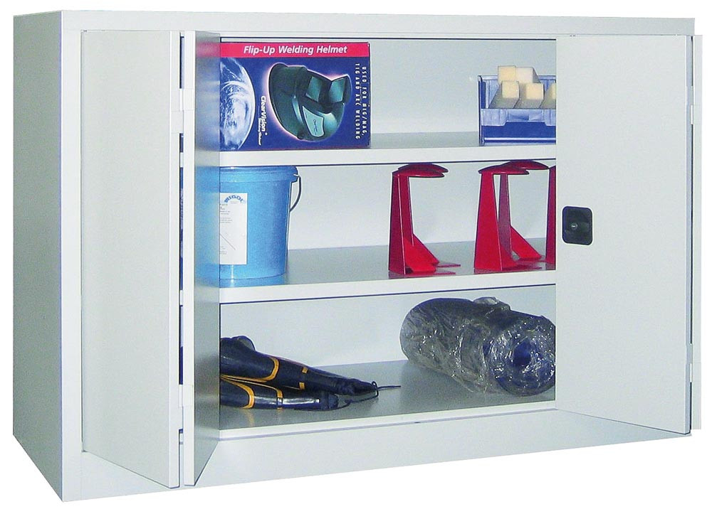 ∙ Stabile Stahlblechkonstruktion ∙ Oberfläche pulverbeschichtet ∙ Schränke mit gemeinsam verschließbaren Vollblech-Falttüren und Verstärkungstaschen ∙ Die Türen sind über einen dreiriegeligen Drehgriff mit integriertem Zylinderschloss inkl. 2 Schlüsseln verschließbar ∙ Böden im Raster von 17 mm höhenverstellbar, Belastbarkeit je Boden 80 kg bei gleichmäßig verteilter Last ∙ Max. Gehäusebelastbarkeit 600 kg