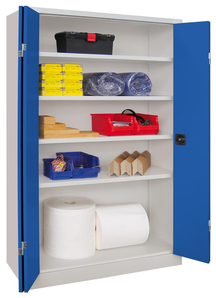 ∙ Stabile Stahlblechkonstruktion ∙ Oberfläche pulverbeschichtet ∙ Schränke mit gemeinsam verschließbaren Vollblech-Falttüren und Verstärkungstaschen ∙ Die Türen sind über einen dreiriegeligen Drehgriff mit integriertem Zylinderschloss inkl. 2 Schlüsseln verschließbar ∙ Böden im Raster von 17 mm höhenverstellbar, Belastbarkeit je Boden 80 kg bei gleichmäßig verteilter Last ∙ Max. Gehäusebelastbarkeit 600 kg
