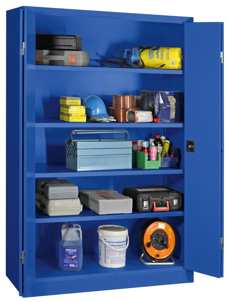 ∙ Stabile Stahlblechkonstruktion ∙ Oberfläche pulverbeschichtet ∙ Schränke mit gemeinsam verschließbaren Vollblech-Falttüren und Verstärkungstaschen ∙ Die Türen sind über einen dreiriegeligen Drehgriff mit integriertem Zylinderschloss inkl. 2 Schlüsseln verschließbar ∙ Böden im Raster von 17 mm höhenverstellbar, Belastbarkeit je Boden 80 kg bei gleichmäßig verteilter Last ∙ Max. Gehäusebelastbarkeit 600 kg