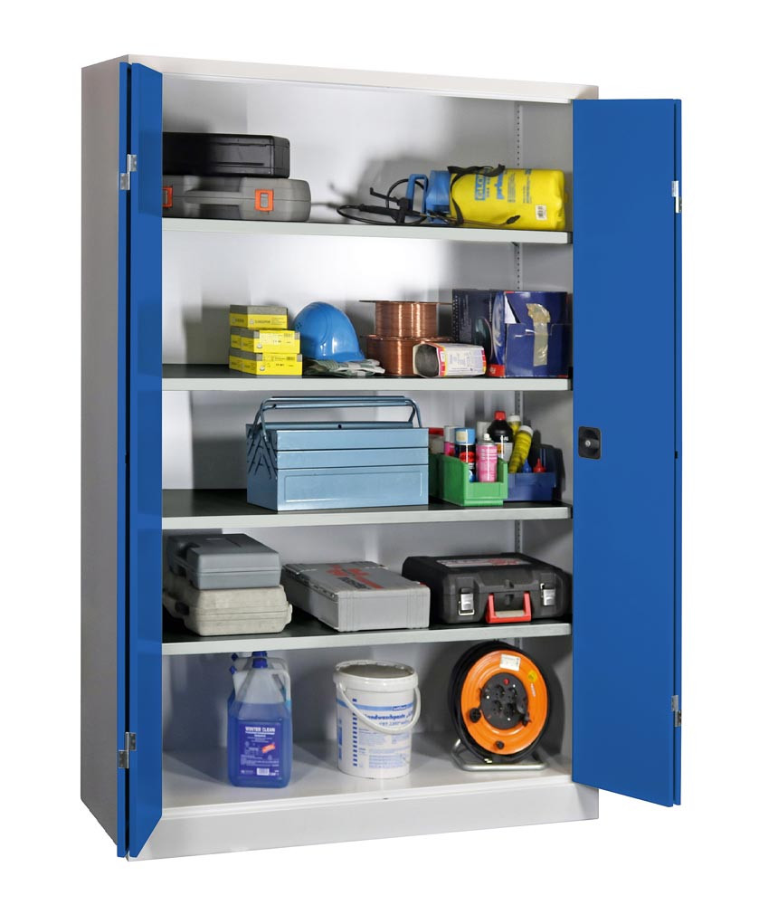 ∙ Stabile Stahlblechkonstruktion ∙ Oberfläche pulverbeschichtet ∙ Schränke mit gemeinsam verschließbaren Vollblech-Falttüren und Verstärkungstaschen ∙ Die Türen sind über einen dreiriegeligen Drehgriff mit integriertem Zylinderschloss inkl. 2 Schlüsseln verschließbar ∙ Böden im Raster von 17 mm höhenverstellbar, Belastbarkeit je Boden 80 kg bei gleichmäßig verteilter Last ∙ Max. Gehäusebelastbarkeit 600 kg