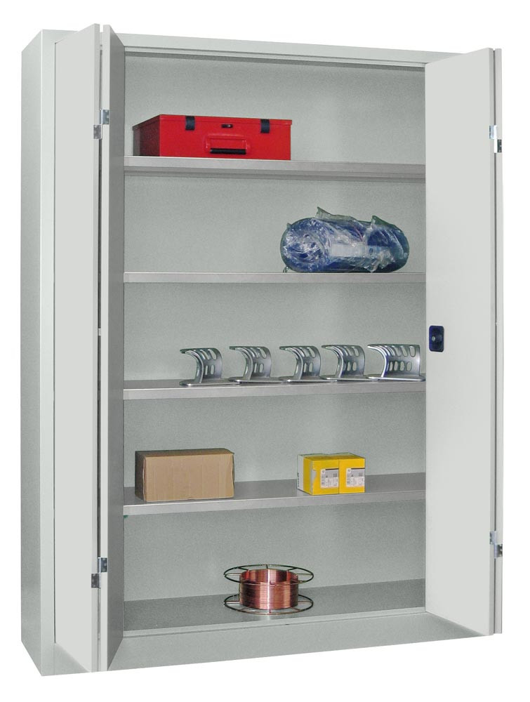 ∙ Stabile Stahlblechkonstruktion ∙ Oberfläche pulverbeschichtet ∙ Schränke mit gemeinsam verschließbaren Vollblech-Falttüren und Verstärkungstaschen ∙ Die Türen sind über einen dreiriegeligen Drehgriff mit integriertem Zylinderschloss inkl. 2 Schlüsseln verschließbar ∙ Böden im Raster von 17 mm höhenverstellbar, Belastbarkeit je Boden 80 kg bei gleichmäßig verteilter Last ∙ Max. Gehäusebelastbarkeit 600 kg