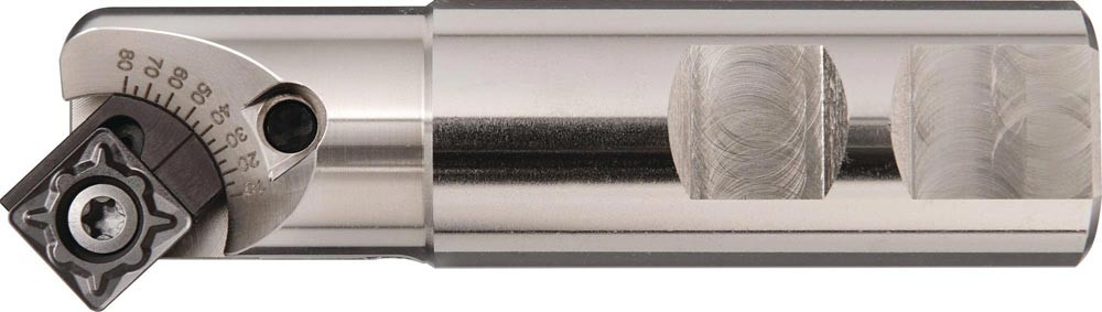 vernickelte Ausführung · mit Innenkühlung · verstellbar · 10° - 80° · universell einsetzbarer Wendeplatten-Frässenker zum Fasen, Entgraten von Kanten, Rund- und Langlöchern und Senken bei starren Einsatzverhältnissen · ruhiger Lauf und stabile Ausführung und stabile Konstruktion · Zylinderschaft mit Mitnahmefläche nach DIN 1835 B · mit SCMT auch als Rückwärtssenker einsetzbar · Verstellbereich D min - D max