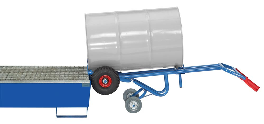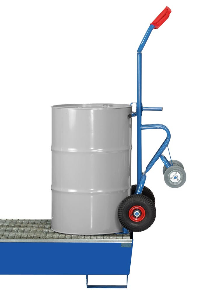 Fasskarre, für 200-l-Fässer mit Rand, BxH 680x1600 mm, Traglast 300 kg, Vollgummibereifung, mit Stützradsatz, RAL 5007 brillantblau E843855