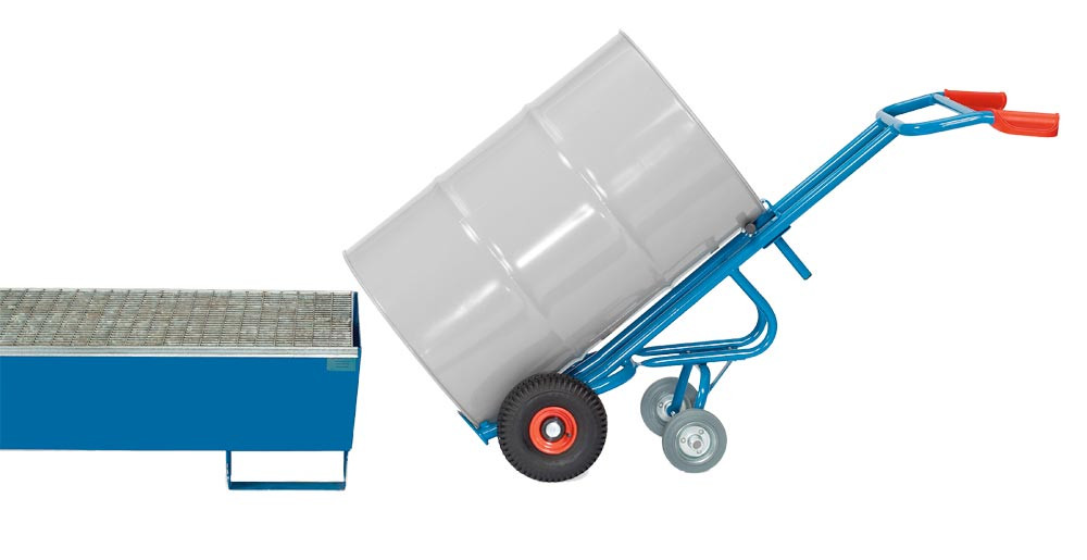Fasskarre, für 200-l-Fässer mit Rand, BxH 680x1600 mm, Traglast 300 kg, Luftbereifung, mit Stützradsatz, RAL 5007 brillantblau E843856
