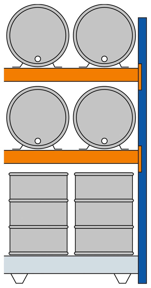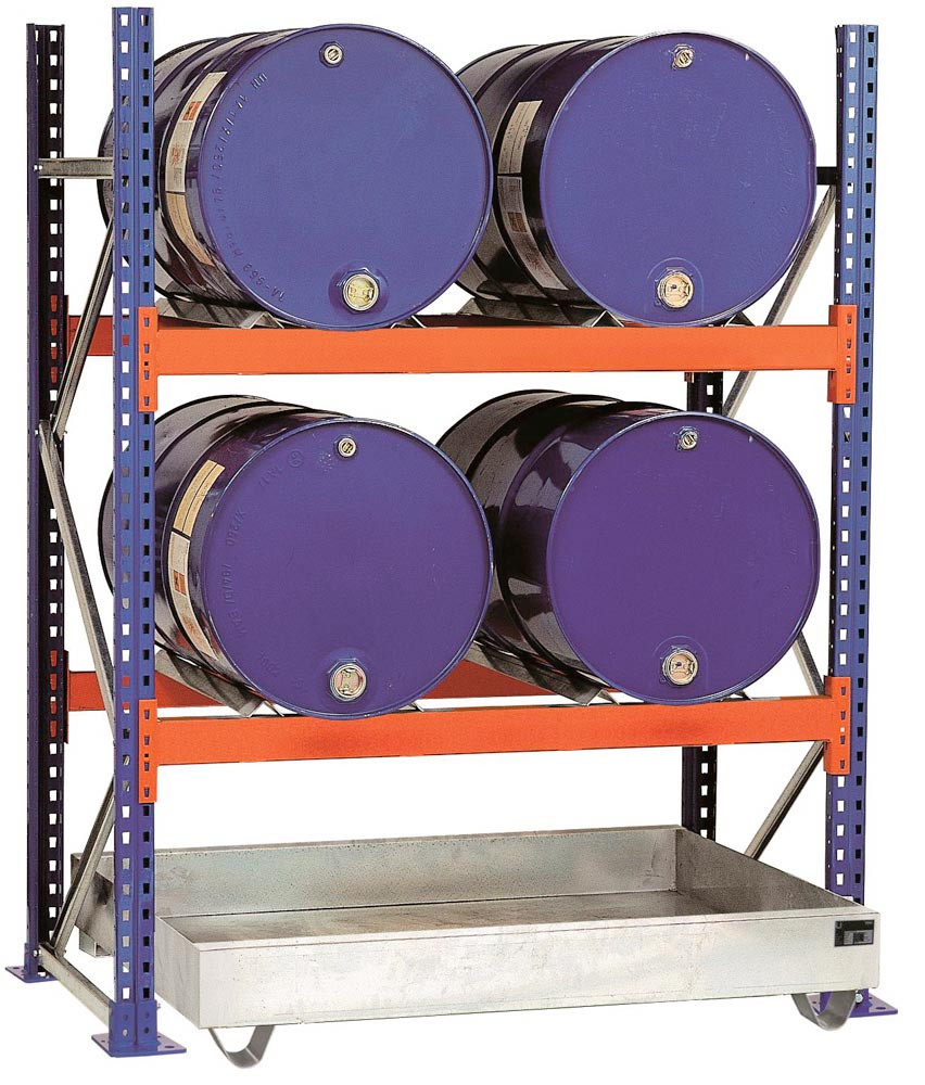 Fassregal, AF, für 4x200 l liegend, 4x200 l stehend, mit Auffangwanne 285 l, BxTxH 1350x850x2500 mm