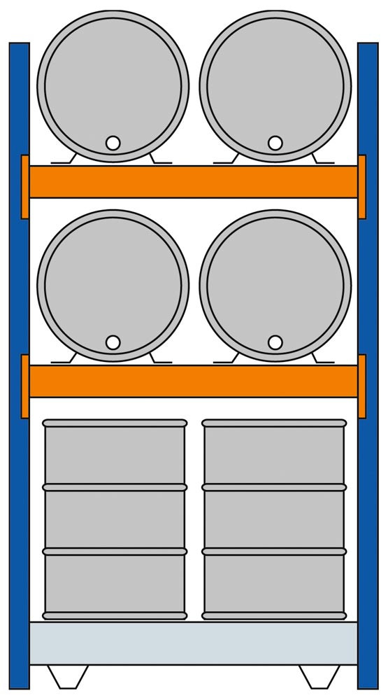 Fassregal, GF, für 4x200 l liegend und 4x200 l stehend, mit Auffangwanne 285 l, BxTxH 1350x850x2500 mm