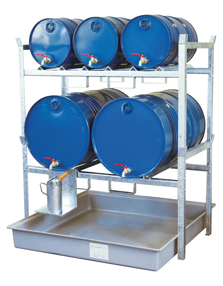 Fassregal, Stahl verzinkt, mit Fassauflage für 2x200-l-Fässer und 3x60-l-Fässer, GFK-Auffangwanne Auffangvolumen 220 l, BxTxH 1410x1280x1620 mm