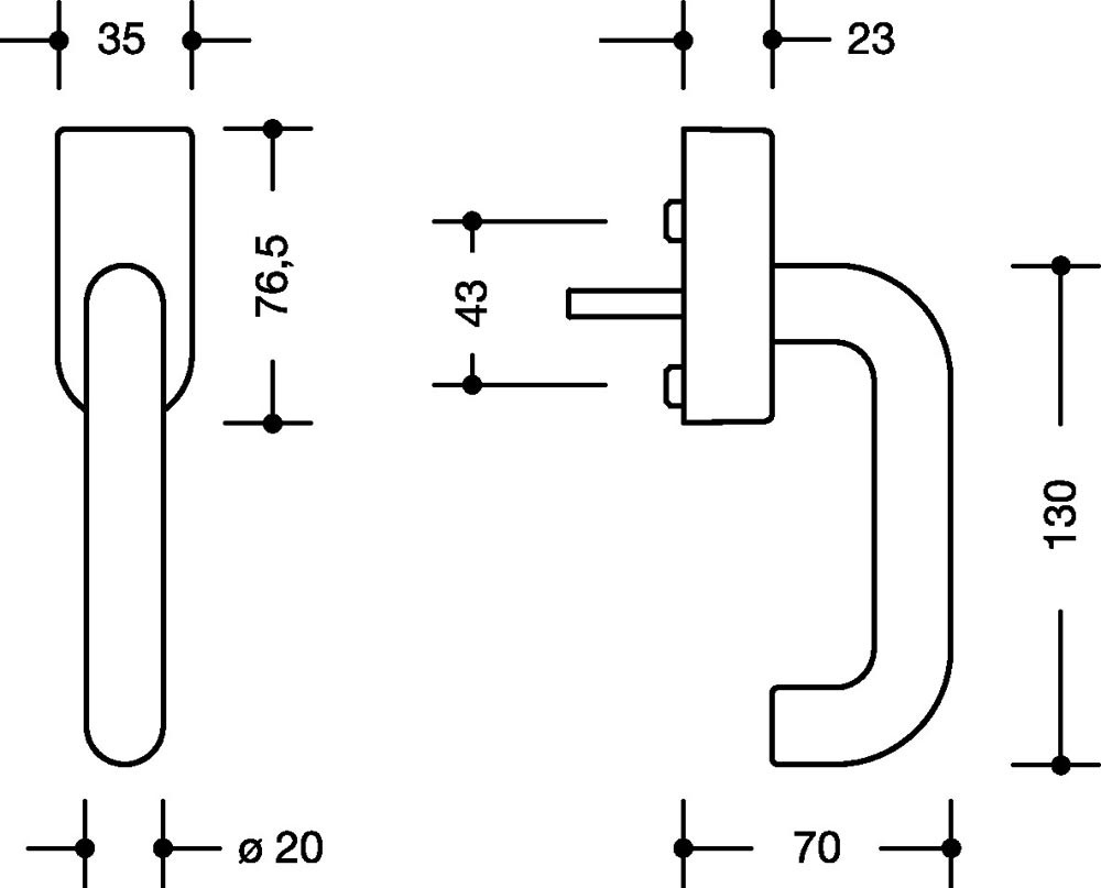 aus mattem Polyamid · Durchmesser 20 mm · 130 mm lang · 7 mm Vierkantstift · der Fenstergriff erfüllt die Vorgaben der DIN 18040 · Rosette mit Metallunterteil, 76,5 x 35 mm · mit Stützzapfen · integrierter Druckzylinder mit 5 Stiftzuhaltungen · Prüfung gemäß RAL-RG 607/9 · im Auftragsfall bitte die genaue Stiftlänge angeben