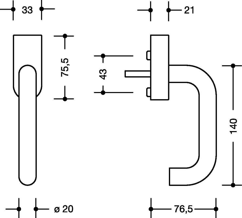 aus Edelstahlrundrohr (1.4301), Durchmesser 21,3 mm, 140 mm lang, mit 1,5 mm Wandstärke, mit 90 Grad-Rastpunkten und 7 mm Vierkantstift, Länge 30 mm vorstehend (andere Längen und 45 Grad-Rastung auf Anfrage). Der Fenstergriff erfüllt die Vorgaben der DIN 18040. Vormontiert auf Rosette mit Metallunterteil, 75,5 x 33 mm, mit Stützzapfen Durchmesser 10 mm, verdeckte Verschraubung, Schraublochabstand 43 mm, Abdeckkappe aus Edelstahl (1.4301), Wandstärke 1,5 mm. Integrierter Druckzylinder mit 5 Stiftzuhaltungen, in allen Raststellungen schließbar, die Schließung wirkt direkt auf den Griff und blockiert die Drehung. Prüfung gemäß RAL-RG 607/9. Incl. 2 Schlüssel. Alle Schließzylinder sind mit dem gleichen Schlüssel schließbar, Schließung 2W005 · Artikel: HEWI 111XAFGA.1