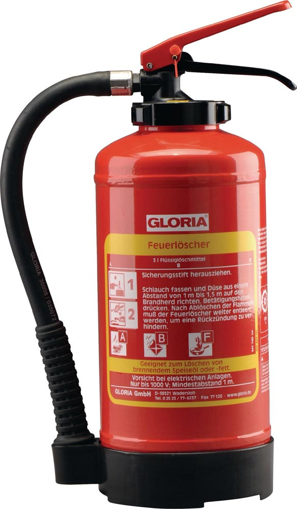 Brandklassen A, B, F · Flüssiglöschmittel mit Spezialeignung für Speiseöle und -fette · bis zu 75 l brennendes Speiseöl oder -fett wird zuverlässig gelöscht · Treibmittelflasche innenliegend (bei 6 l-Löscher) · Temperaturfunktionsbereich: -30 ºC bis +60 ºC · 3 l-Löscher: Aufladefeuerlöscher · prüf- und nachfüllbar · mit Wandhalter