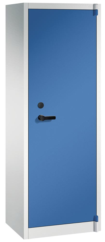 Feuergeschützter Flügeltürenschrank, BxTxH 650x500x1950 mm, 1-türig, 4 Fachböden, RAL 7035/5010 lichtgrau/enzianblau