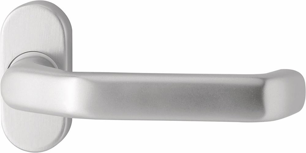 für Feuerschutzrahmentüren · gekröpft · fest-drehbar auf ovaler Rosette · mit Hochhaltefeder · Rosette Stärke 14,5 mm · Höhe 75 mm · Breite 34 mm · verdeckte Verschraubung · Norm DIN 18273 / DIN EN 1906