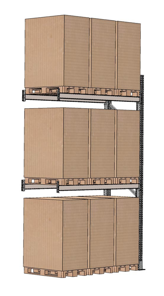 ∙ Feuerverzinkte Oberflächenbeschichtung ∙ Für die Lagerung von Europaletten mit einer Palettenhöhe von max. 2530 mm ∙ Palettengewicht bis 1000 kg ∙ Warmgewalzte IPE-Holme mit 5 Agaffenhaken ∙ Schraubenanker inkl. Folienpatrone ∙ Mindestanforderung: 3 Felder mit mindestens je 2 Holmebenen