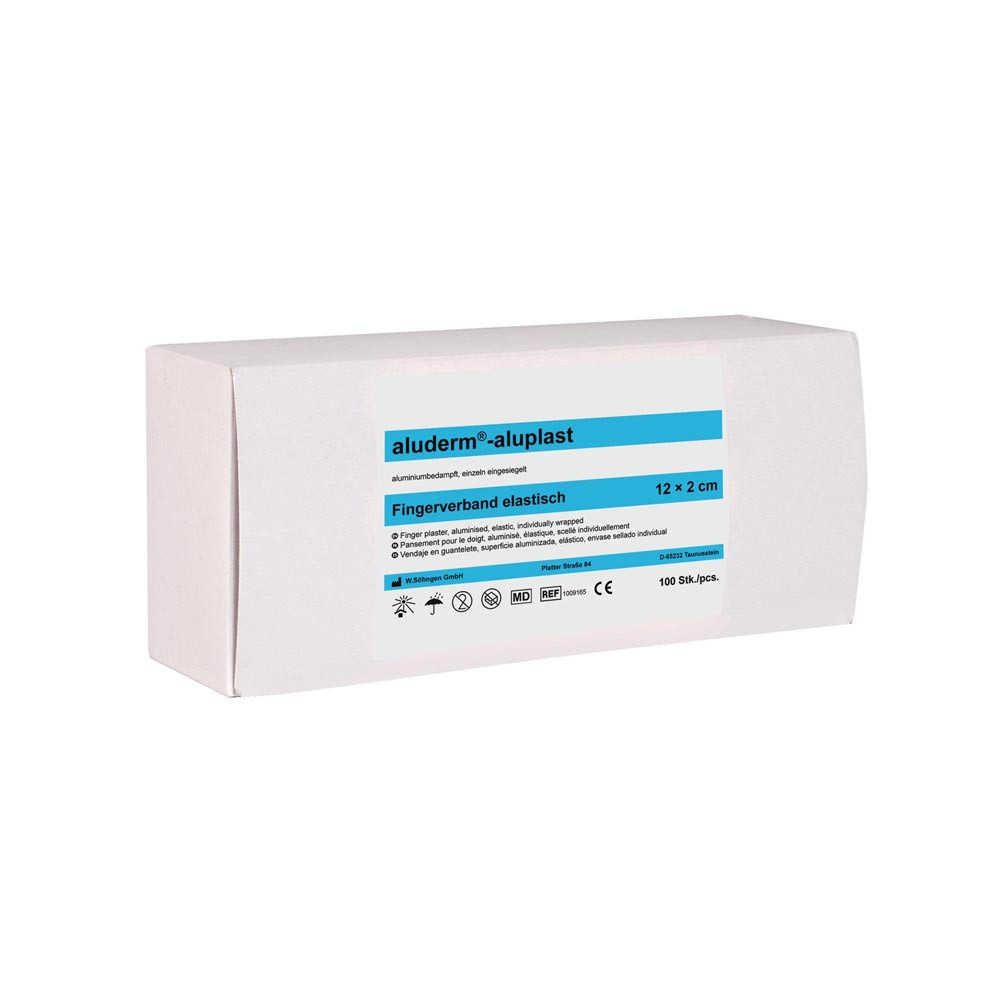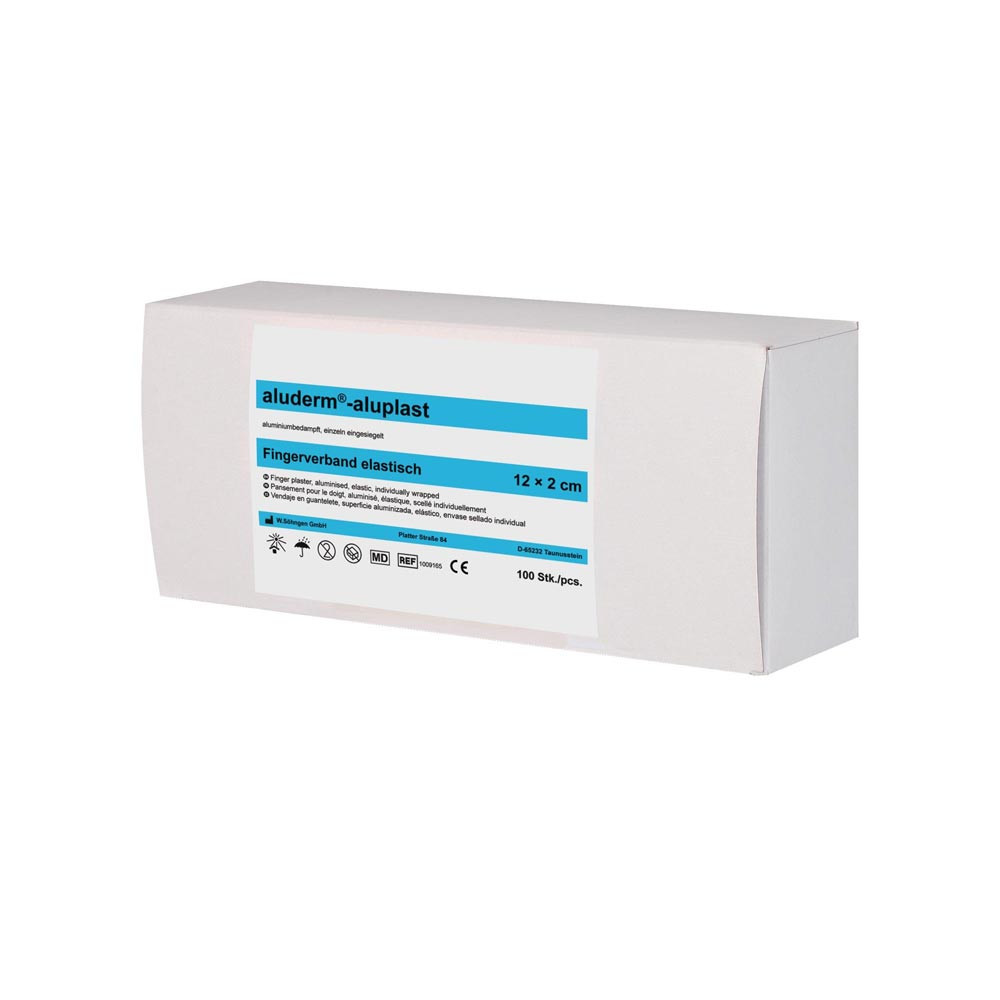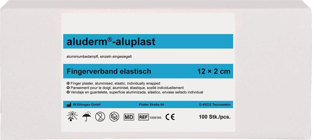 Faltschachtel mit 100 St. aluderm®-aluplast Fingerverbänden ca. 12 x 2 cm, die aluderm® Wundauflage ist mit Aluminium bedampft · aluderm®-aluplast verklebt nicht mit der Wunde, fasert nicht, ist stark saugend, atmungsaktiv, fördert Hautbildung und Heilung