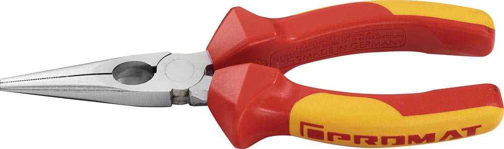mit Schneide (Radiozange) · VDE-isoliert bis 1000 V · gefertigt gem. DIN EN/IEC 60900, stückgeprüft · gerade, flach-rund Backen, mit Brennerloch · Greifflächen gezahnt · Schneiden zusätzlich gehärtet, Schneidenhärte ca. 60 HRC · Spezial-Werkzeugstahl, ölgehärtet und angelassen