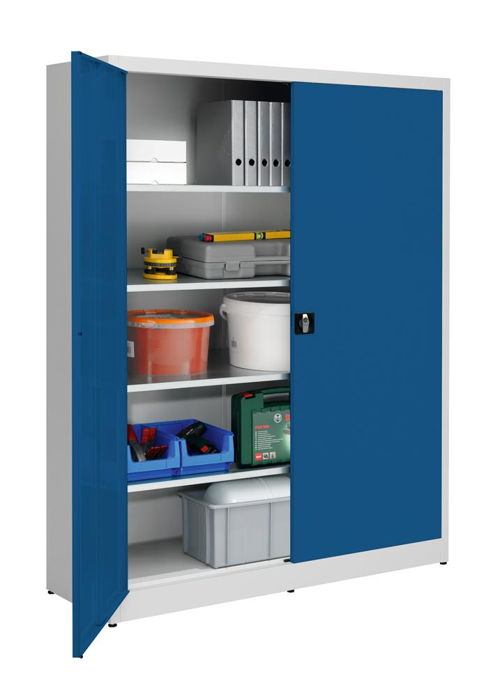 Flügeltürenschrank, 4 verz. Fachböden, BxTxH 1500x600x1965 mm, RAL7035 lichtgrau/RAL5010 enzianblau