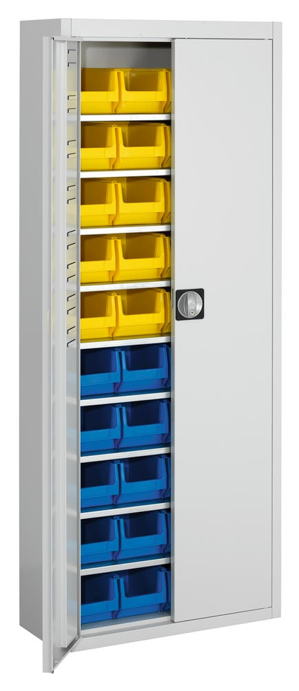 Flügeltürenschrank, BxTxH 680x280x1740 mm, RAL 7035 lichtgrau, Fachlast 50 kg, mit Sichtlagerkästen: 20xGr. 4 gelb, 20xGr. 4 blau