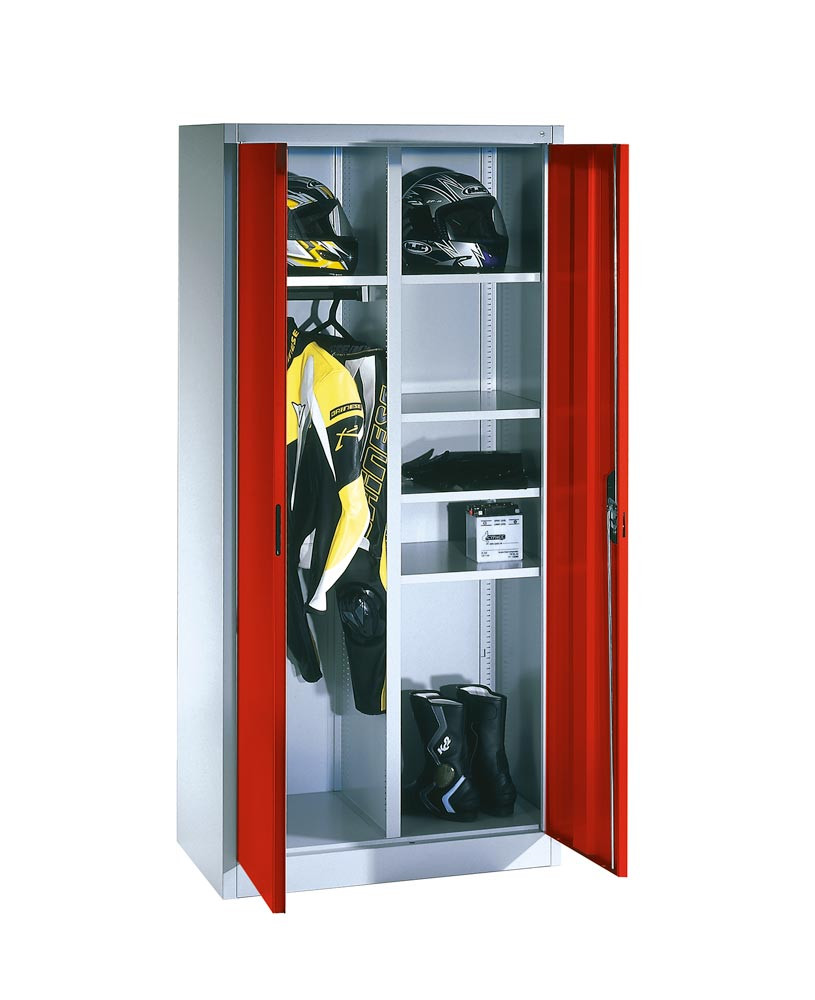 Flügeltürenschrank, BxTxH 930x400x1950 mm, links 1 Hutboden + 1 Kleiderstange, rechts 4 halbe Böden, RAL 7035/3003 lichtgrau/rubinrot