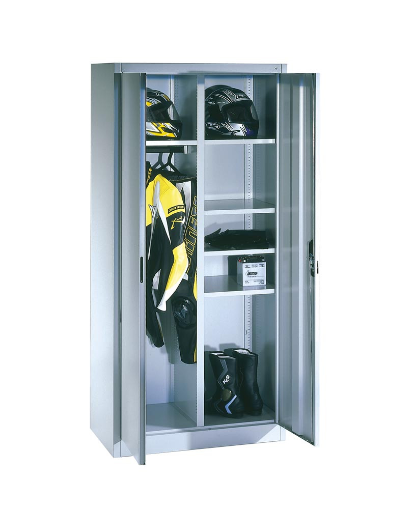 Flügeltürenschrank, BxTxH 930x400x1950 mm, links 1 Hutboden + 1 Kleiderstange, rechts 4 halbe Böden, RAL 7035 lichtgrau