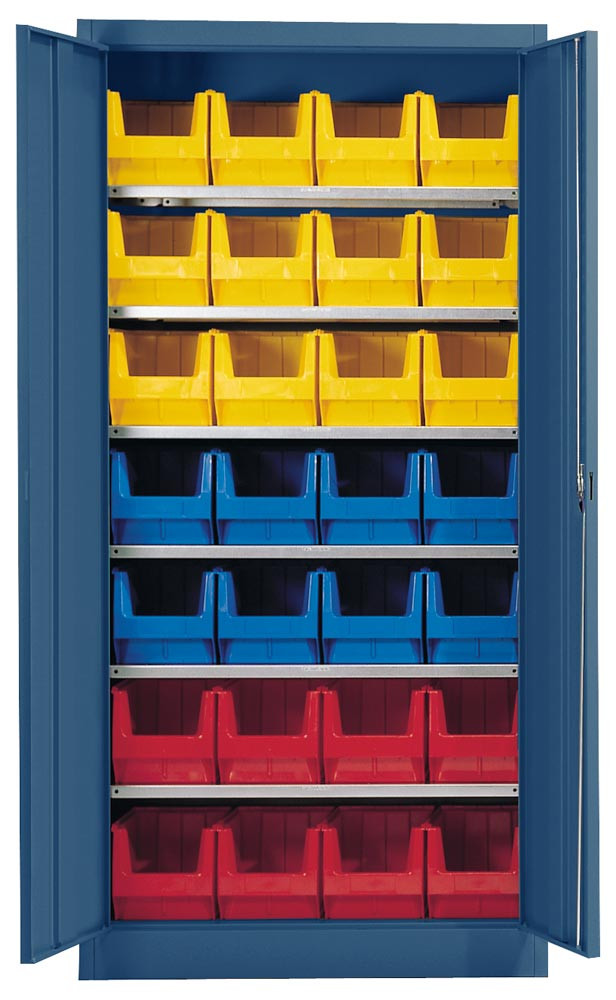 Flügeltürenschrank, BxTxH 950x420x1950 mm, RAL 5007 brillantblau, Fachlast 80 kg, mit Kästen: 8xGr. 3 rot, 8xGr. 3 blau, 12xGr. 3 gelb E861388